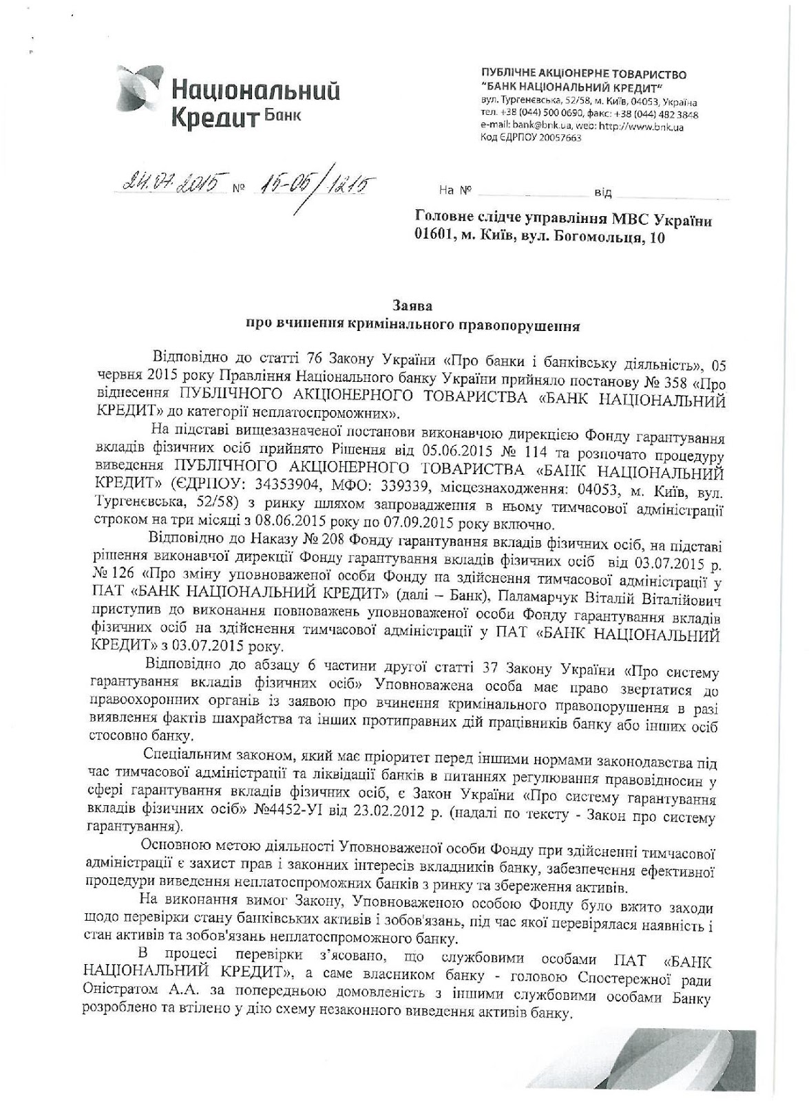 «В процессе проверки выяснилось, что должностными лицами ПАО «Банк Национальный кредит», а именно владельцем банка — председателем Наблюдательного совета Онистратом А.А. по предварительной договоренности с другими должностными лицами Банка разработана и реализована схема незаконного выведения активов банка», — сказано в заявлении представителя ФГВФЛ Виталия Паламарчука, пишет Politica-UA.com.