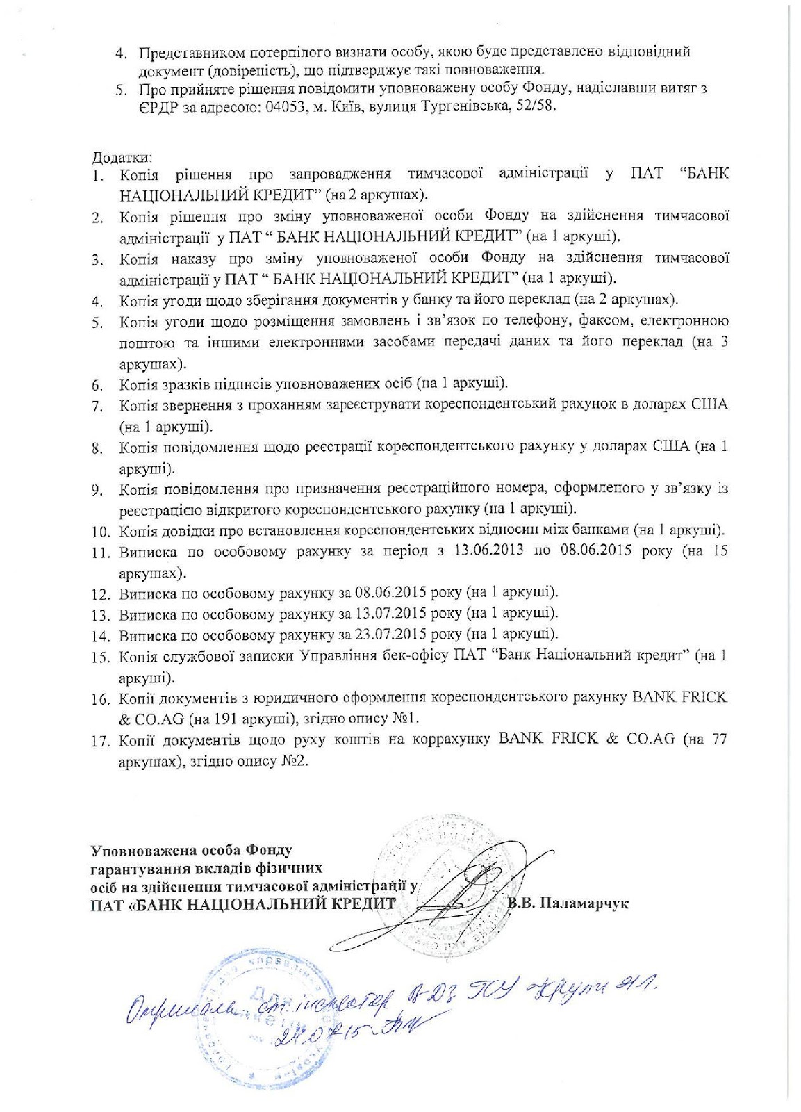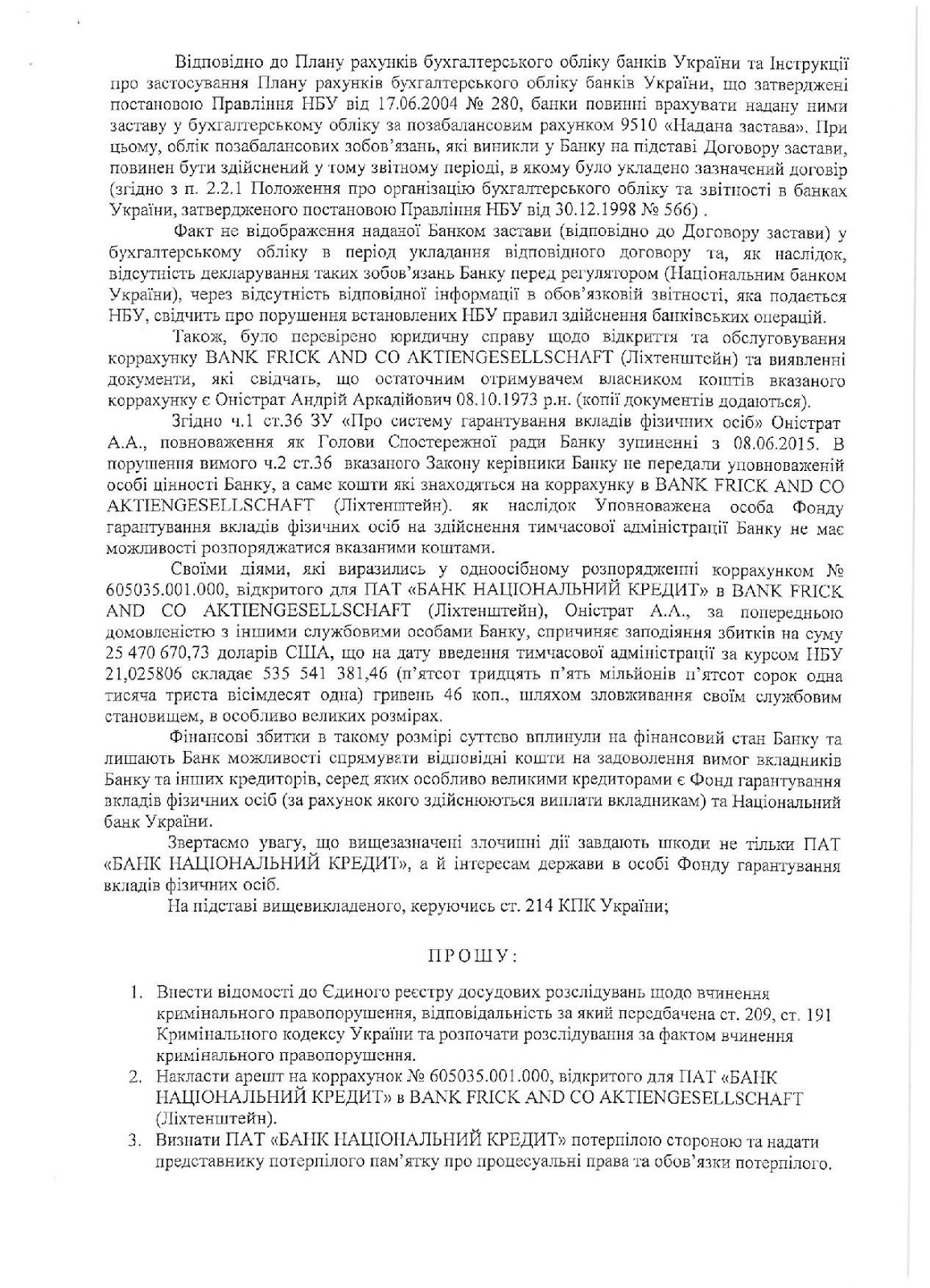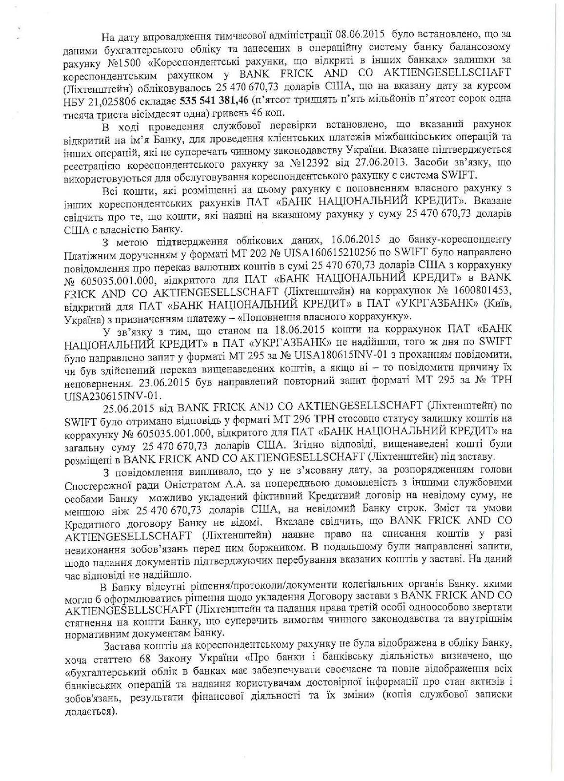 Согласно информации, изложенной в заявлении, на дату введения в Национальный кредит временной администрации, менеджеры банка перевели в «Bank Frick and Co Aktiengesellschaft» 25,5 миллионов долларов. Документы, которые подтверждают эти переводы сохранились в банке, но наличие этих денег Онистрат скрыл от Национального банка Украины, они не были отражены в обязательной отчетности.