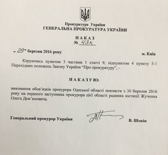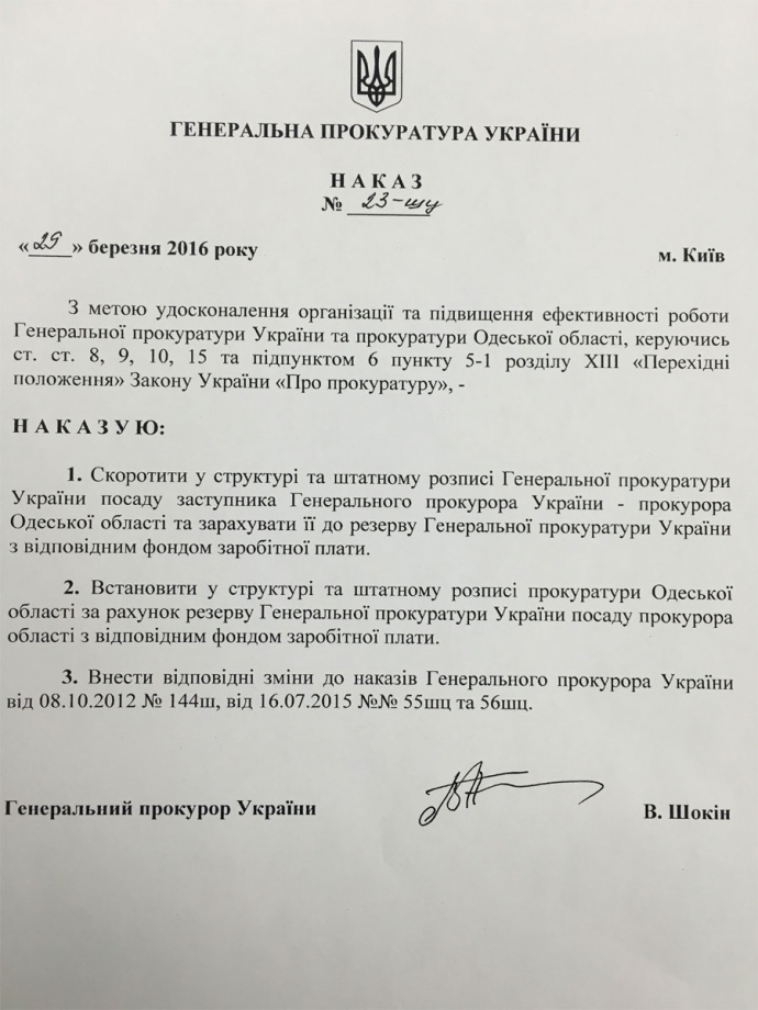 Однако в этот же самый день до голосования по отставке Генпрокурора стало известно, что Виктор Шокин уволил со своей должности молодого грузинского реформатора Давида Сакварелидзе. Соответствующий приказ опубликован на официальном портале ГПУ. Официальной причиной увольнения значится, что в ГПУ не единожды поступали запросы от нардепов о несоответствии законодательства «О прокуратуре» и в штатном расписании силового ведомства должности замгенпрокурора — прокурора Одесской области, которую занимает Сакварелидзе, не существует.