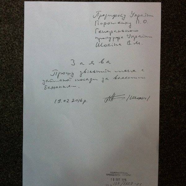 Народные депутаты 29 марта 2016 года 289 голосами удовлетворили заявление Генпрокурора Виктора Шокина и проголосовали за его отставку. С требуны Парламента представитель президента в ВРУ Степан Кубив сообщил, что Шокин попросил рассматривать вопрос об отставке без него.