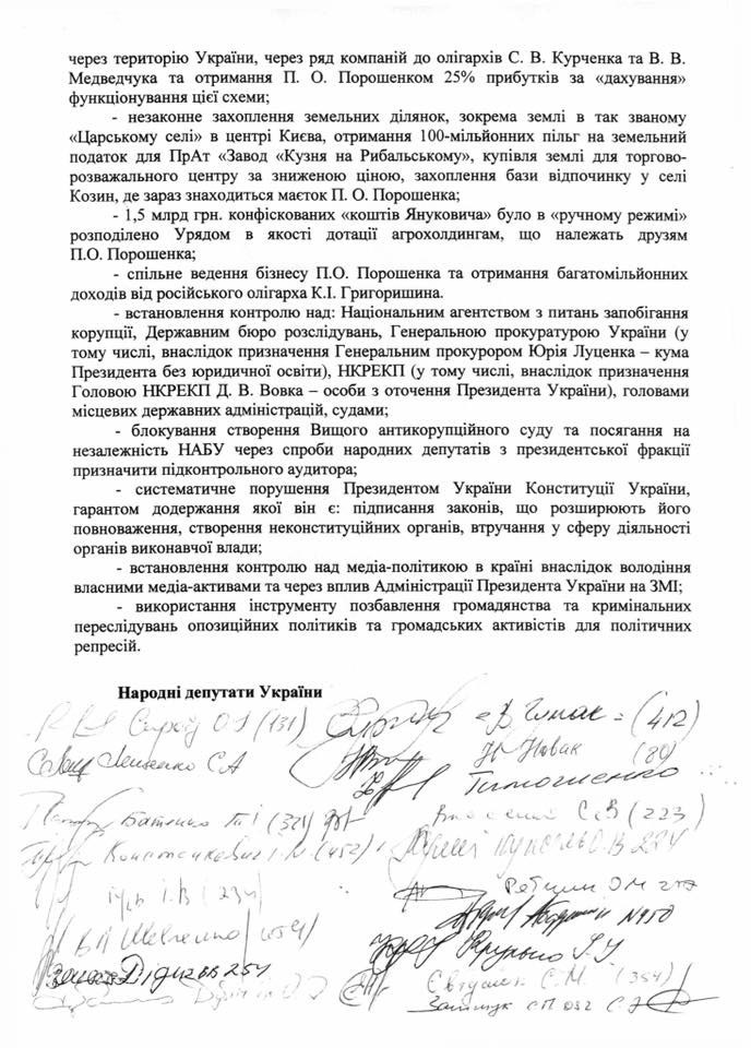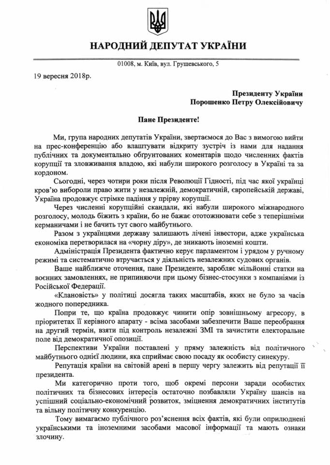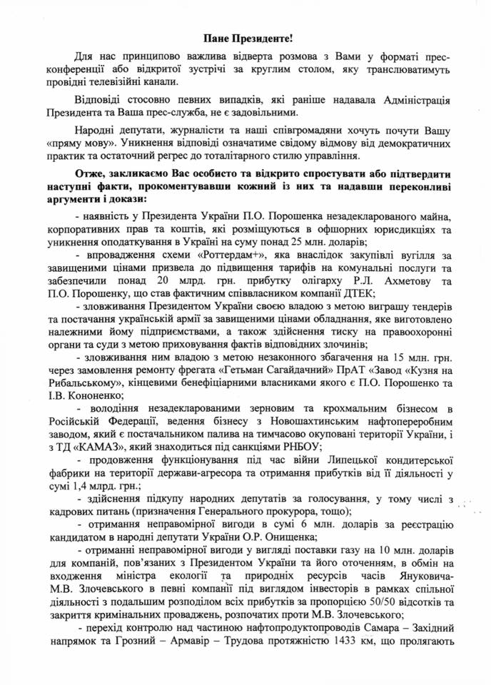 Как свидетельствует обнародованный нардепом документ, депутаты требуют «публичного разъяснения всех фактов, которые были обнародованы украинскими и иностранными СМИ и имеют признаки преступления».