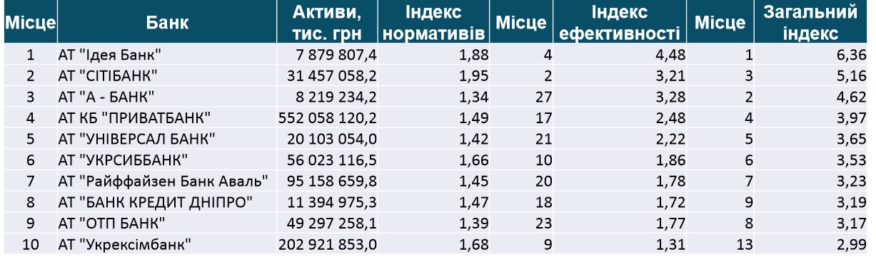 При этом в ТОП-10 рейтинга постоянно находились семь банков: АТ «Ідея Банк», АТ «СІТІБАНК», АТ «А — БАНК», АТ КБ «ПРИВАТБАНК», АТ «УНІВЕРСАЛ БАНК», АТ «Райффайзен Банк Аваль» и АТ «ОТП БАНК».