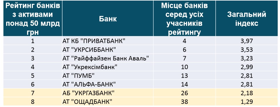Оценивались банки с активами более 2 миллиардов гривен, а также отдельно крупные банки с активами более 50 миллиардов гривен. В рейтинг не вошли финучреждения с российским государственным капиталом («Сбербанк», «Проминвестбанк»).