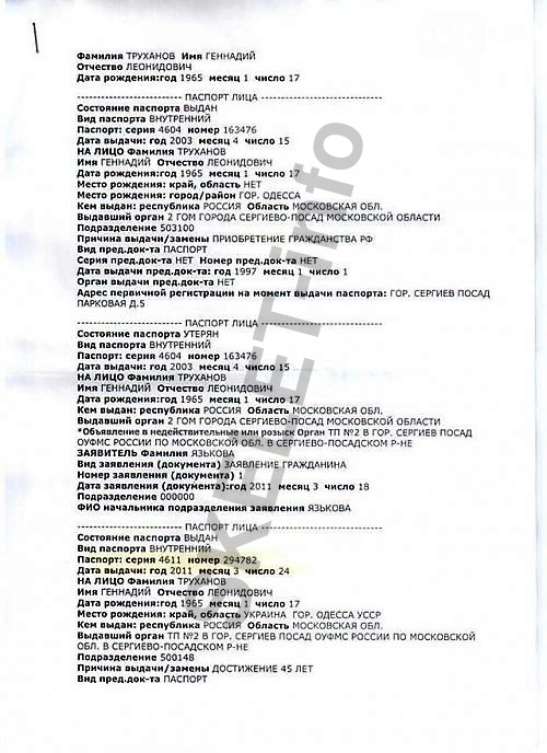 Итак, 15 апреля 2003 года Геннадий Труханов получил в миграционном отделе города Сергиев Посад Московской области паспорт серии 4604 №163476. Любопытно, что в качестве причины получения паспорта указывалось «получение гражданства РФ», а вот данные его предыдущего удостоверения личности отсутствовали. Затем 24 марта 2011 года в том же миграционном отделе Сергиева Посада на имя Труханова был выдан другой паспорт гражданина РФ серии 4611 №294782, по причине утери ранее выданного документа. Кстати, в этих же документах была указана и подмосковная прописка Труханова – во всё том же патриархальном Сергиевом Посаде, в старом деревянном доме. Причем, именно эта прописка Труханова указана в регистрационных документах его оффшорных фирм «Macon Assets Limited» и «Corderoy Trading Limited»!