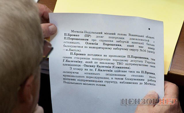 Новые неприятности ожидали Петра Бровко на парламентских выборах 2012 года. В них он был виноват уже сам: Бровко Петр Петрович договорился с Петром Порошенко, который тогда был министром иностранных дел в правительстве Азарова и главой набсовета Нацбанка, о том, что организует победу на мажоритарном округе №16 папе олигарха, Алексею Порошенко. Однако на этот и соседние округа положил глаз влиятельнейшей винницкий семейный клан Калетников, из которых самым известным и одиозным был тогдашний глава Таможенной службы Игорь Калетник. Из-за этого 16-го округа, по которому семья хотела провести в Раду Оксану Калетник, разгорелась нешуточная межклановая война, в которой Петр Бровко едва не стал крайним. В итоге Калетники победили, семья Порошенко отступила (и обиделась на регионалов, решив примкнуть к оппозиции), а Петр Бровко отделался испугом, хоть и не легким. А могло быть и хуже, судя по той записке, что глава фракции ПР Ефремов передал в сессионном зале Калетнику-старшему: