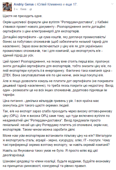 Исполнительный директор ИК Конкорд-Капитал Андрей Герус в своем Facebook написал, что Кабмин собирается принять распоряжение, в результате чего может возрасти цена на электроэнергию для населения.