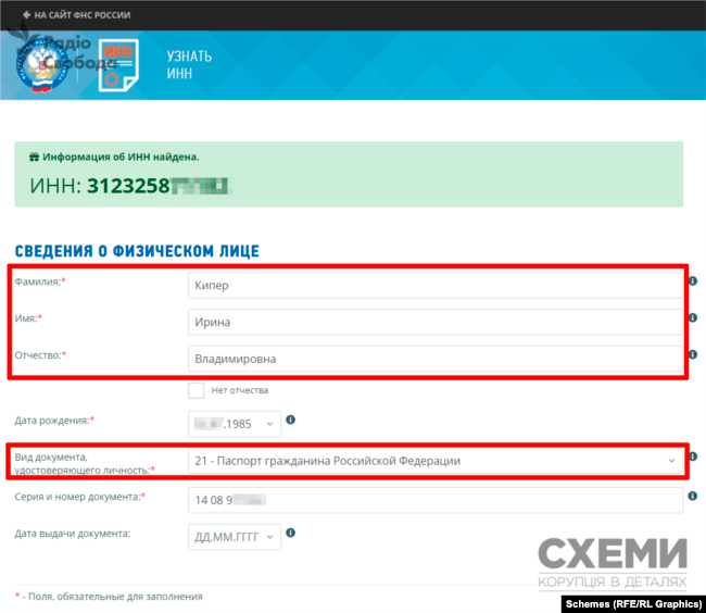 «Схемы» обнаружили, что российский паспорт его жены Ирины Кипер до сих пор не аннулирован. Подлинность документа по состоянию на момент публикации журналисты проверили с помощью официального сервиса МВД России. Этот паспорт среди недействительных не значится. Также, используя данные паспорта, на официальном сайте Федеральной налоговой службы России «Схемы» нашли ее индивидуальный номер налогоплательщика.