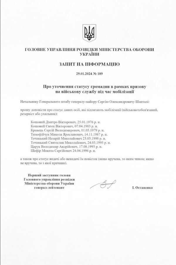 Зокрема, заступник голови ГУР Ігор Остапенко збирав дані про статус у рамках призову (резервіст, військовозобов’язаний чи ухилист) близьких Єрмака та родичів високопосадовців із його оточення. Під запитом до Генштабу ЗСУ стоїть його підпис.