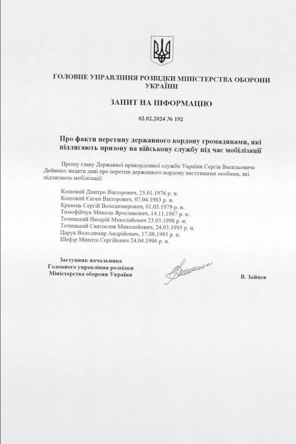 Головне управління розвідки цікавилося: соратником Єрмака Євгеном Кошовим та його братом Дмитром, чоловіком учасниці «Квартал 95» Олени Кравець — Сергієм Кравцем, братом нардепа від «Слуги народу» Володимира Тимофейчука — Миколою Тимофейчуком, синами міністра культури Миколи з Миколая нардепа від «Слуги народу» Ігоря Фріске — Володимиром Царуком, а також сином екс-помічника президента Сергія Шефіра — Микитою.