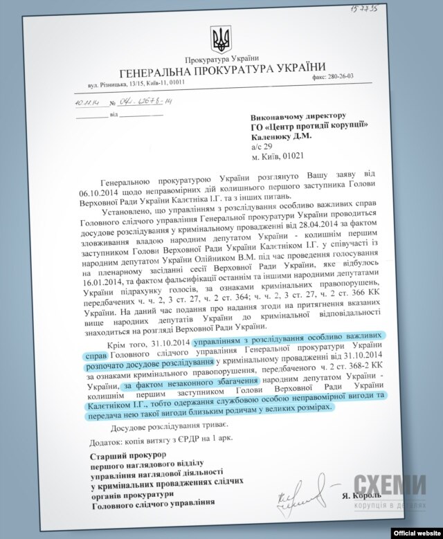 Как ответил на запрос организации «Центр противодействия коррупции» старший прокурор Главного следственного управления Я. Король: «Управлением по расследованию особо важных дел начато досудебное расследование по факту незаконного обогащения Калетником, то есть получения должностным лицом неправомерной выгоды и передачи им такой выгоды близким родственникам в крупных размерах».