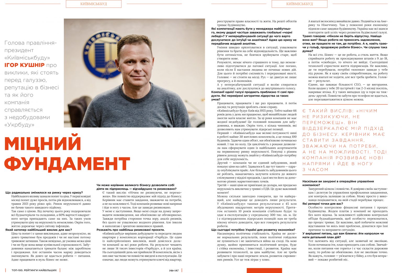 Глава правления-президент «Киевгорстроя» Игорь Кушнир в интервью журналу «ТОП-100» рассказал о вызовах, которые стоят перед строительной отраслью, репутации в бизнесе и факторах, которыми компания отличается от конкурентов.
