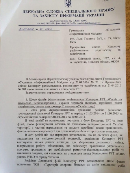 В частности, как стало известно нашему изданию, чиновника подловили на откровенной лжи. Так, г-н Евдоченко в своем официальном ответе (см. ниже) на запрос Общественного объединения «Информационный майдан» №01-1996 от 20 мая 2016 года сообщил (п.1), что ревизия, которую провела Госфиниспекция финансовой деятельности КРРТ в «пивнюковско-ищуковский» период (2014-2015 гг.) якобы «не установлено нарушений со стороны КРРТ и его филиалов по финансированию объектов на неподконтрольной Украине территории в части начисления и выплаты зарплаты работникам, фактов оплаты электроэнергии для трансляции российских каналов не выявлено».