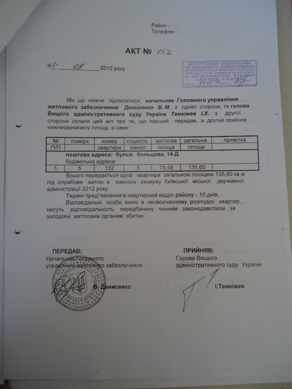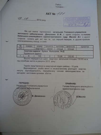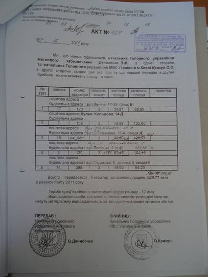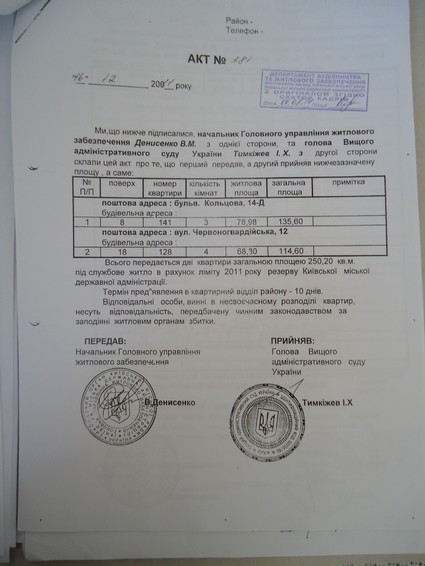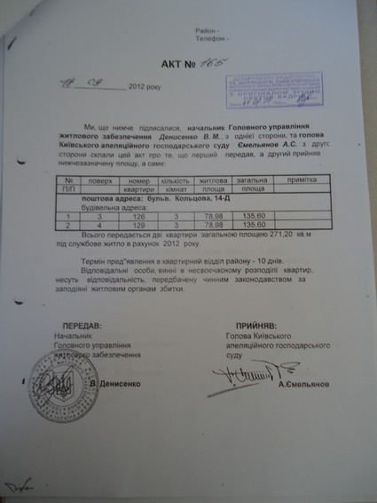 Можно воспользоваться и другим примером. Бывший заместитель прокурора Киева Владимир Гоголь участвовал в принятии и распределении квартир от жилищного департамента Киевской городской администрации в течение 3 лет как минимум. Именно он в 2008 году направил письмо, извещавшее Дарницкую райгосадминистрацию об успешно осуществленном обмене и выдаче новой квартиры прокурору Александру Корнийцу. Его же подпись стоит под имеющимся в распоряжении автора данной статьи актом приема-передачи 15 квартир в новостройках, полученных Киевской прокуратурой от Главного управления жилищного обеспечения КГГА 13 декабря 2011 года. Наивно полагать, что за три года такой деятельности Гоголь не сумел разобраться в том, что именно он делал и чем это чревато в правовых А ведь таких актов за эти года было подписано не одну тысячу и не одной лишь прокуратурой Киева!