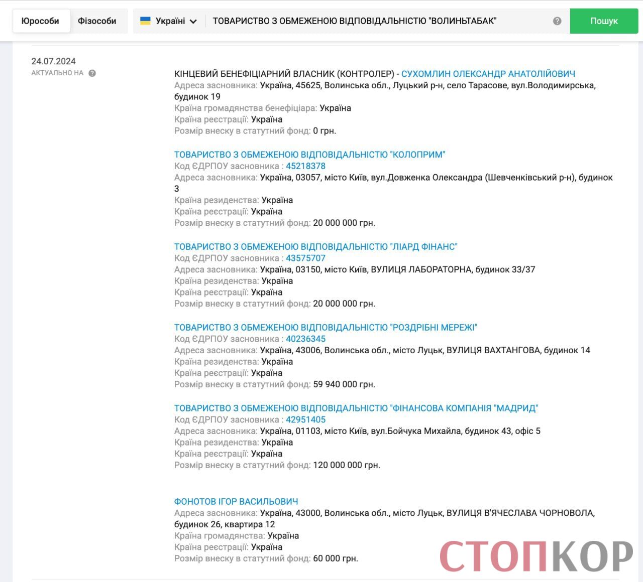 В то же время, СтопКор из собственных источников в правоохранительных органах узнал, что подозрение сообщили Александру Сухомлину, бывшему владельцу и гендиректору «Волыньтабака». Однако открытая регистрационная информация свидетельствует: еще 25 июля 2024, т.е. до периода возможного преступления, Сухомлин вышел из состава владельцев.