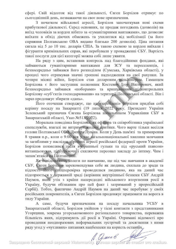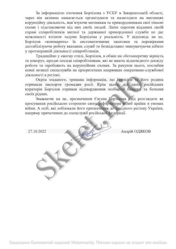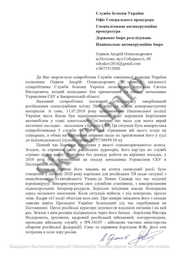 К Вам обращается сотрудник Службы внешней разведки Украины полковник Одяков Андрей Александрович по поводу деятельности сотрудника Службы безопасности Украины полковника Борзилова Евгения Викторовича, недавно назначенного на должность начальника Управления СБУ в Закарпатской области.