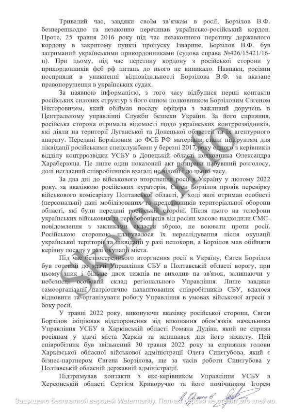 Поддерживал контакты с экс-руководителем Управления УСБУ в Херсонской области Сергеем Криворучко и его помощником Игорем Садохиным, которые, как и Евгений Борзилов, по указанию российских кураторов способствовали врагу в оккупации южной области и сдали Херсон. У него были дружеские отношения с экс-начальником Управления СБУ в АР Крым Олегом Кулиничем, который сотрудничал с россиянами и способствовал воплощению их планов на территории южных областей Украины. До последнего контактировал со своим давним знакомым, сожителем по комнате во время учебы, сдавшимся в плен россиянам Владимиром Дмитриевым и дает показания относительно своих коллег по службе. Следует отметить, что на видео допросов Владимира Дмитриева, которые обнародовали россияне, он не упоминает имя Евгения Борзилова, хотя увольнялся с должности заместителя начальника УСБУ в Полтавской области (вероятно, владеет реальной информацией относительно своего начальника).