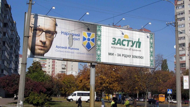 Народный фронт. Верен себе. В прошлый раз на бигбордах был камуфляжный зеленый цвет. В этот раз полувоенная крестово-каштанная геральдика. Нелегко им увязывать рекламу с реальным управлением страной. Хотя то, что «фронт змін» плавно перешел в «народный фронт», интуитивно оправдано. Но для полноты бренда недоиспользовано прилагательное «народный». Бренд – он только тогда бренд, когда каждое слово – на вес золота. А тут «народа» немножко не хватает – правительство замкнуто в основном на себя. Ведь фронт – он фронт не только на границе, он теперь в каждом доме. А это для выборов было бы ключевым.