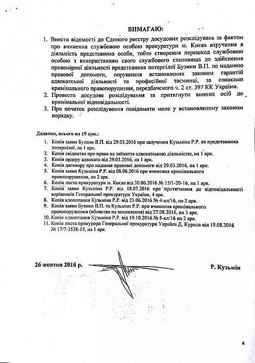 За каких-то полгода Кузьмин успел стать «защитником и представителем» матери убитого Олеся Бузины, инициатором дорасследования дела Гергия Гонгандзе и возбуждения нового дела против Леонида Кучмы, он обвинил Юрия Луценко в покупке своей должности (через Александра Онищенко, подробнее о котором в статье Александр Онищенко: человек со вкусом скандала), а Петра Порошенко (Справка о нём: Петр Порошенко: биография и вся правда о «шоколадном короле» Украины) в государственной измене.