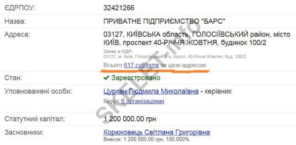У Корюковец была строительная фирма «Дрим Ленд» (34180761), она совладелица обслуживающего кооператива «Столичный» (40863474) и владеет ООО «ПАКО Торг» (32847052). А вот еще одна их фирма, тоже занимающаяся недвижимостью: ООО «Барс» (32421266), зарегистрированное по адресу Голосеевский проспект 100/2 (см. фото здания), и там же находиться его ООО «Фирос» (39488451), занимающейся розничной торговлей продуктами, алкоголем и табаком. Удивляет то, что по этому же адресу, согласно базам данных, зарегистрировано еще более 600 различных фирм. Похоже, что туда давно стоит наведаться соответствующим органам!