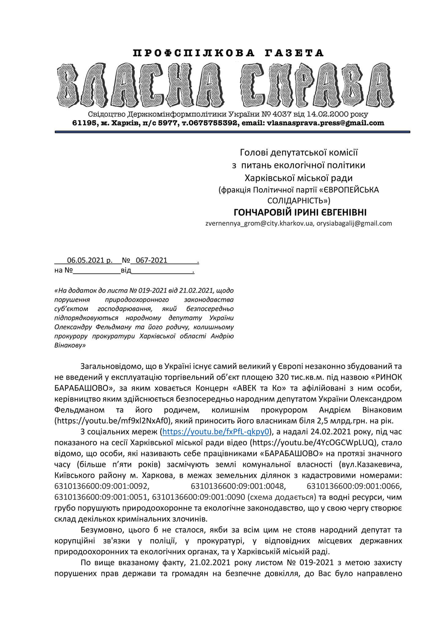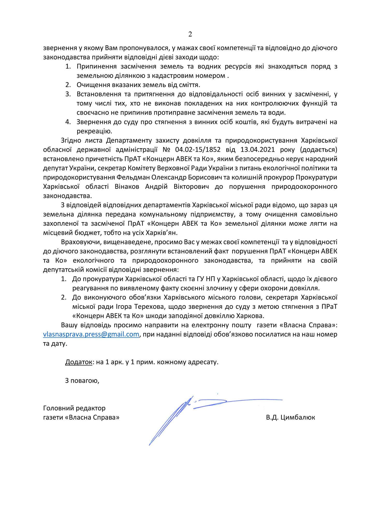 Несмотря на то, что от профильной депутатской комиссии, никаких внятных ответов не поступило, а за это время по обращениям газеты «Власна Справа» были проведены соответствующие мероприятия и установлен, не только факт незаконной свалки, но и то, что эту свалку организовал ПрАТ «Концерн АВЕК и Ко», в адрес председателя Депутатской комиссии по вопросам экологии Харьковского городского совета Ирина Гончарова, направлено новое обращение (прилагается) со скринштом даты и временем отправки официального письма на электронную почту Харьковского горсовета и личную электронную почту председателя Депутатской комиссии по вопросам экологии Харьковского городского совета Ирина Гончарова.
