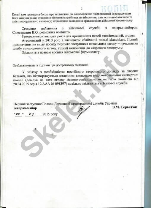 Ну а сам Слюсарев в апреле 2013-го, уже стараниями своего друга Пшонки, получил повышение в столицу – на должность начальника отдела внутренней безопасности Департамента персонала Администрации пограничной службы Украины, вместе с которой ему вручили погоны генерал-майора. На ней он благополучно пережил «революцию достоинства», и в августе 2014-го поднялся еще выше, возглавив всё Управление внутренней безопасности Администрации погранслужбы. Он стал героем хвалебных газетных публикаций – правда, в ведомственной прессе. Но это было его последнее место работы на госслужбе: в апреле 2015-го Слюсарева тихонько отправили в отставку, оформив это как увольнение по собственному желанию в связи с семейными обстоятельствами (см. документ).