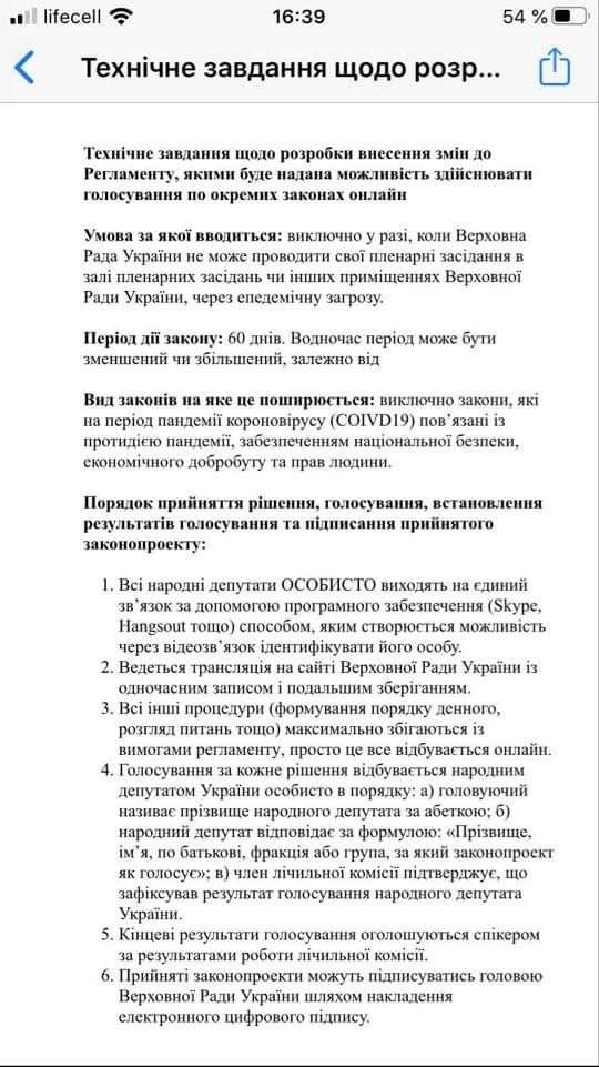 Как сказано в документе, в случае невозможности проводить заседание Верховной рады из-за эпидемической угрозы, голосование за определенные законы, которые относятся к противодействию пандемии, обеспечении национально безопасности, экономического благосостояния и прав человека, буду проводиться в режиме онлайн.