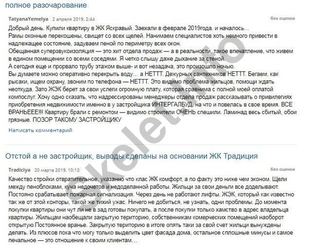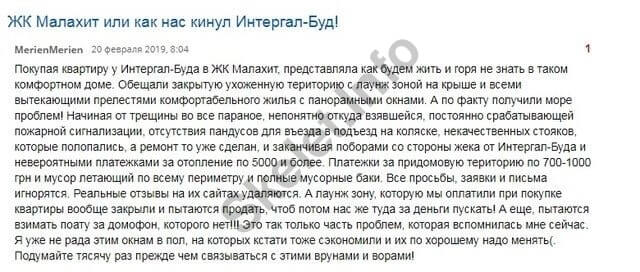 А теперь мы предлагаем вам ознакомиться с отзывами людей, купивших квартиры в ЖК, построенных «Интергал-Буд» и другими фирмами Зубика. Прочитав их, создается впечатление, что это возмущенные голоса наших предков из 70-х, когда жилье строилось ударными темпами, и о качестве его отделки никто не заботился. Но в новых квартирах от «Интергал-Буда» не только не комфортно, а иногда просто и опасно жить!